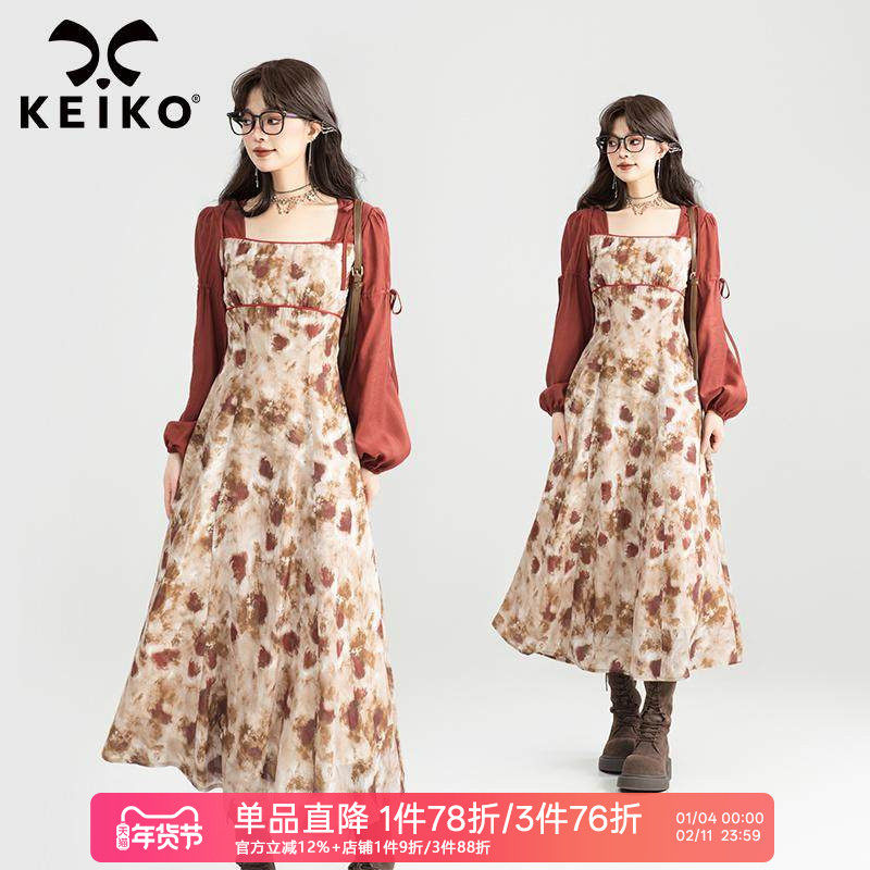 KEIKO 法式复古晕染碎花连衣裙26春季气质通勤泡泡袖方领雪纺长裙