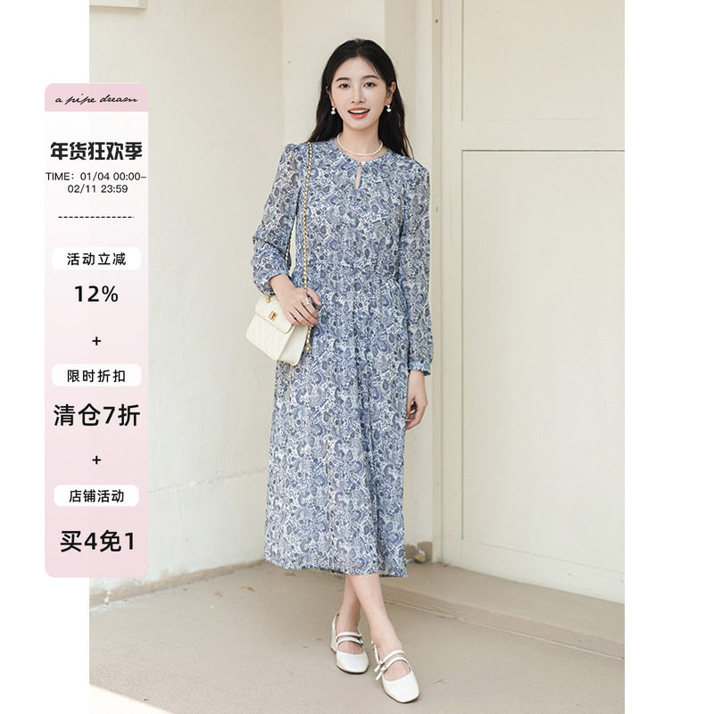 朱珠同款法式复古长袖雪纺连衣裙女秋季度假风显瘦气质碎花长裙子