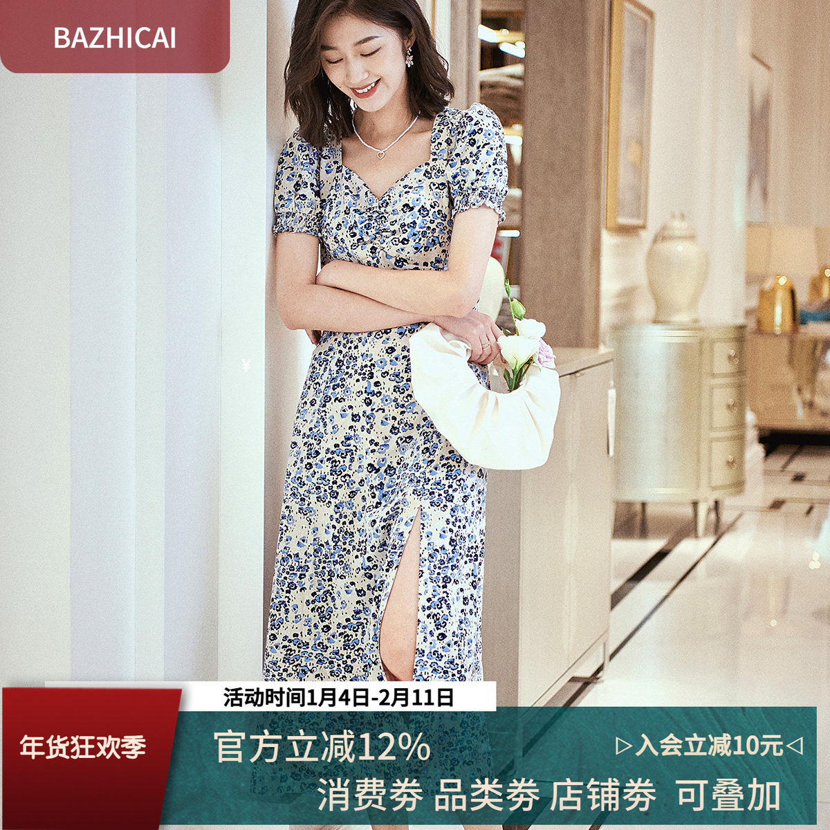 蓝色显白显瘦清新复古碎花雪纺连衣裙方领赫本仙女收腰大摆A字裙