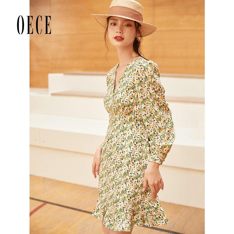 Oece春秋装新款女装 复古小碎花裙子春秋复古长袖雪纺连衣裙