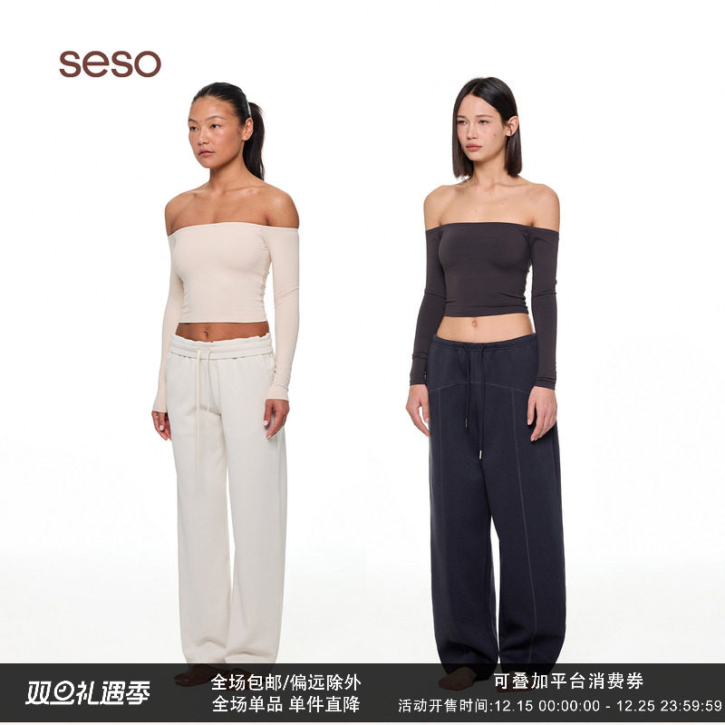 NEVA HU 一字肩针织衫女高级感chic韩系优雅修身露肩长袖t恤上衣