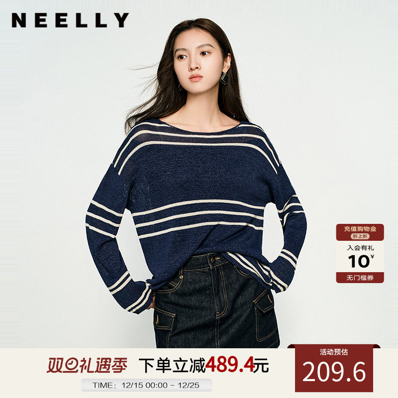 NEELLY纳俪商场同款秋冬新款条纹一字肩针织衫女圆领显白修身毛衣