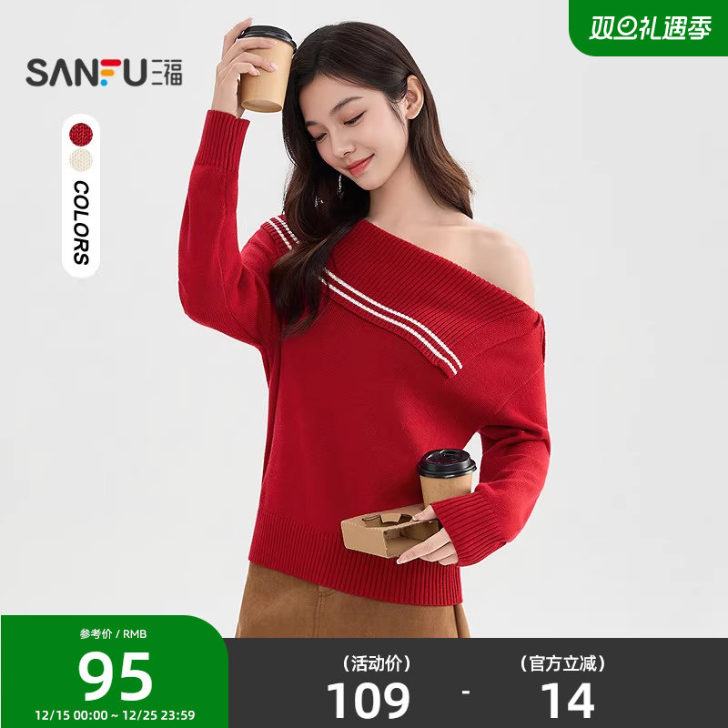 三福红色毛衣冬季2025条纹一字肩针织衫设计感针织上衣女装509075