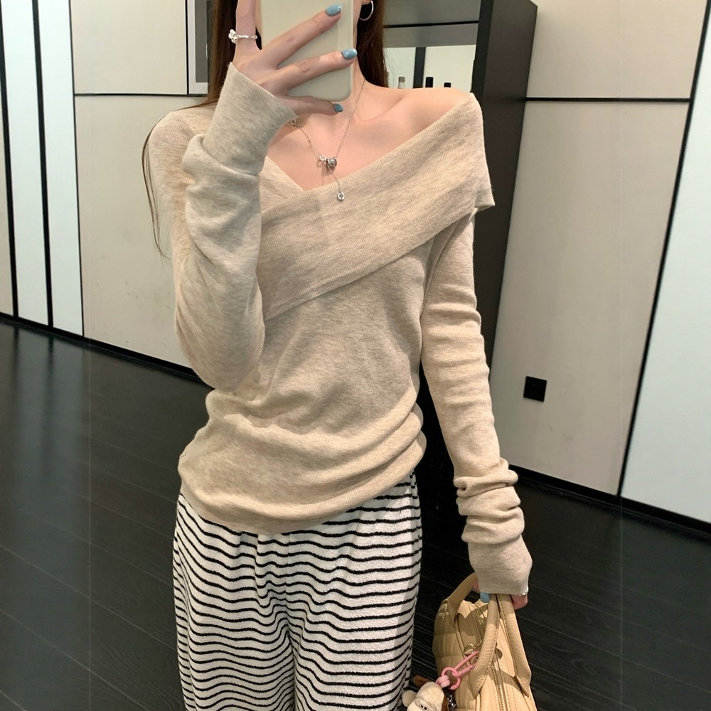 秋冬季韩系纯欲温柔风交叉V领一字肩针织衫长袖女打底毛衣女内搭