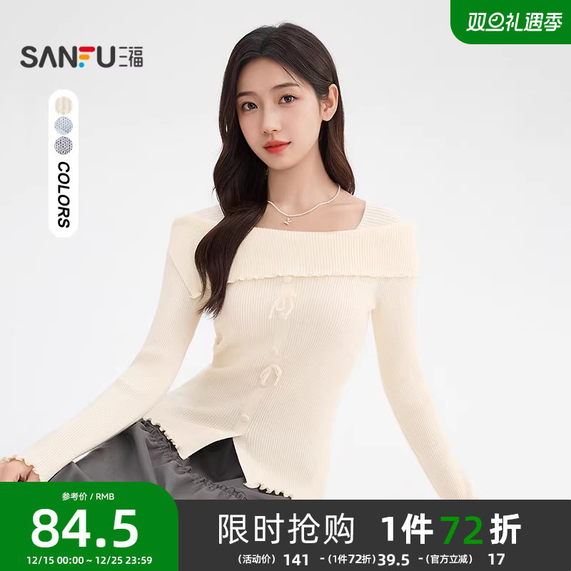 三福毛衣2025新款冬季温柔系穿搭木耳边一字肩针织衫修身上衣女装