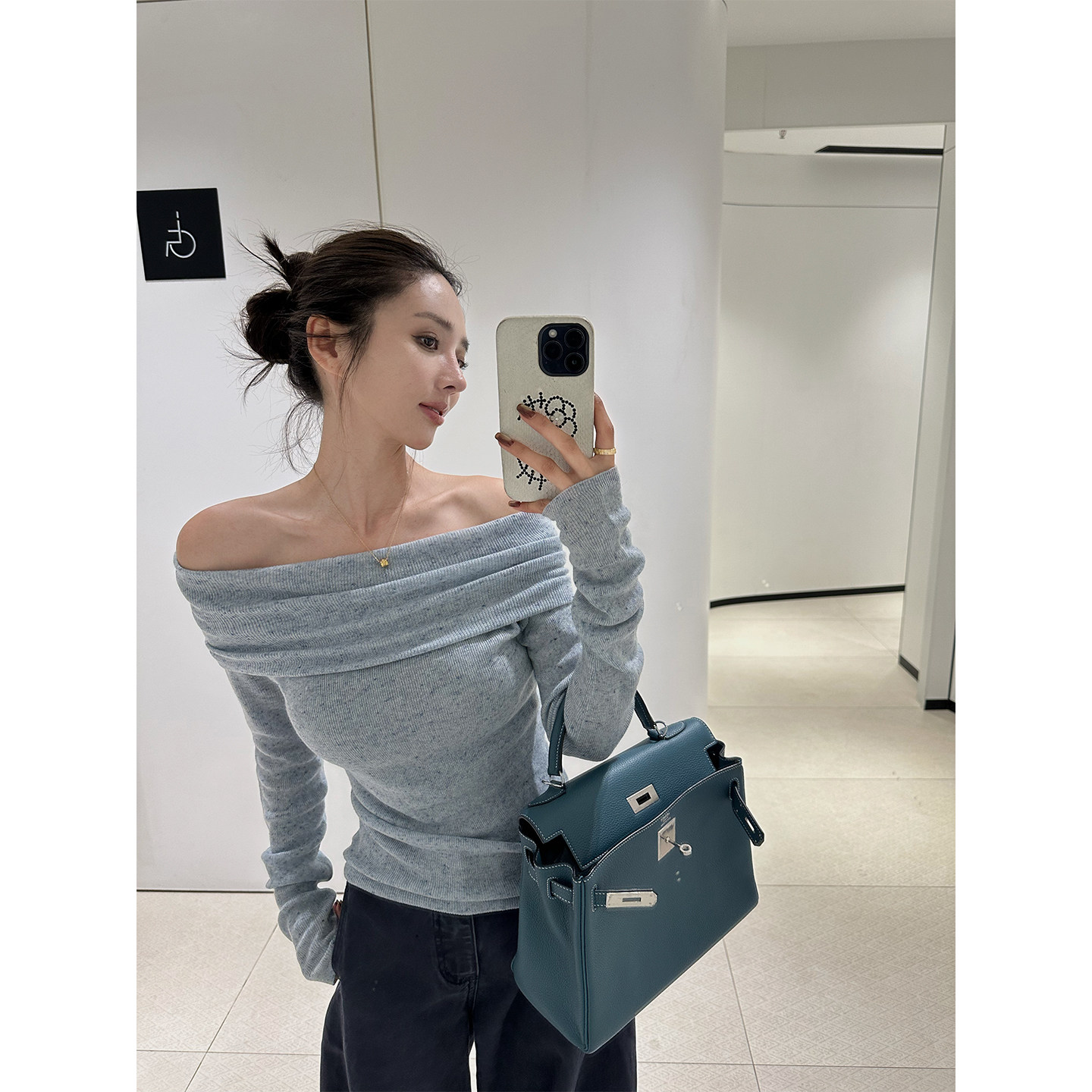 E7Q8 法式温柔一字肩针织衫女修身显瘦辣妹长袖打底温柔纯欲毛衣