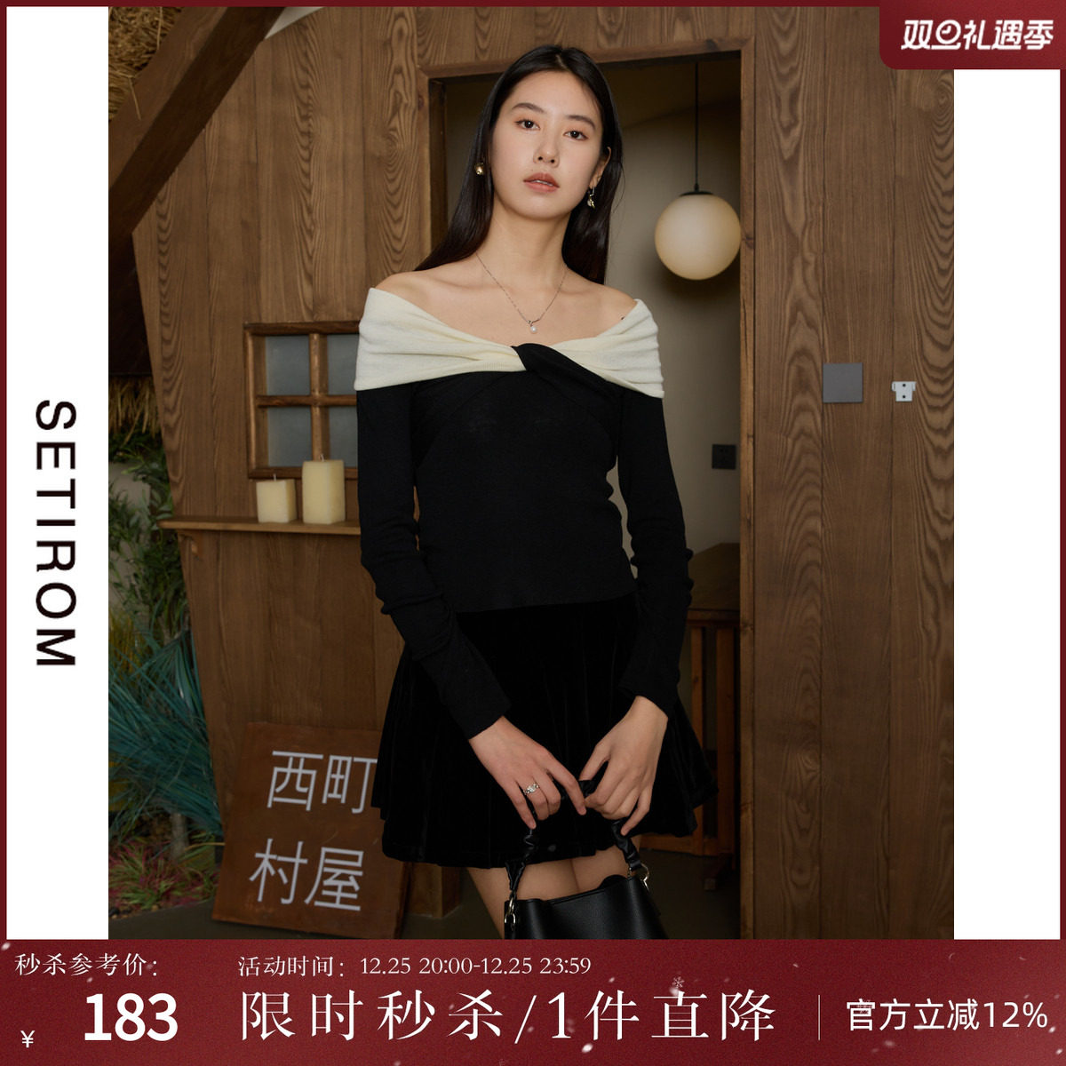 西町村屋一字肩针织衫女百搭春季新款撞色修身长袖上衣AA9112014