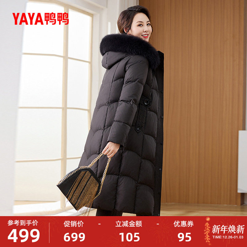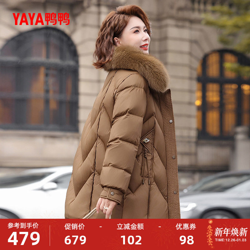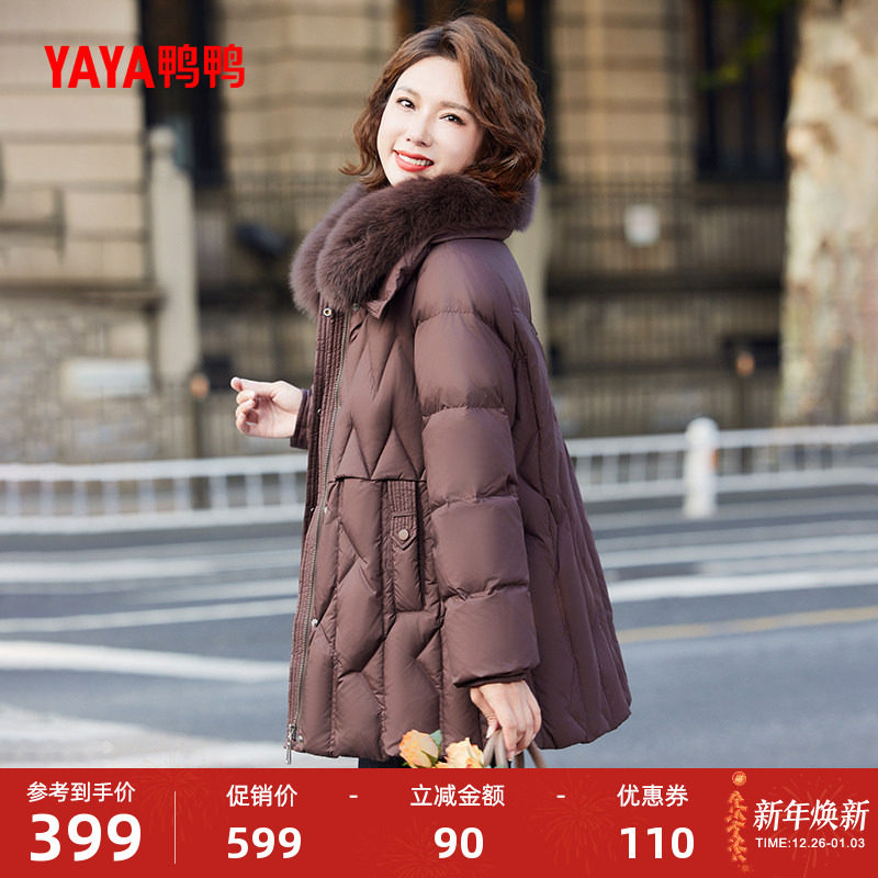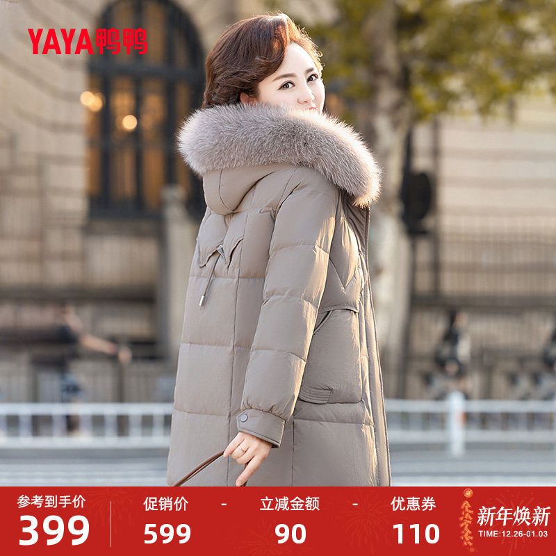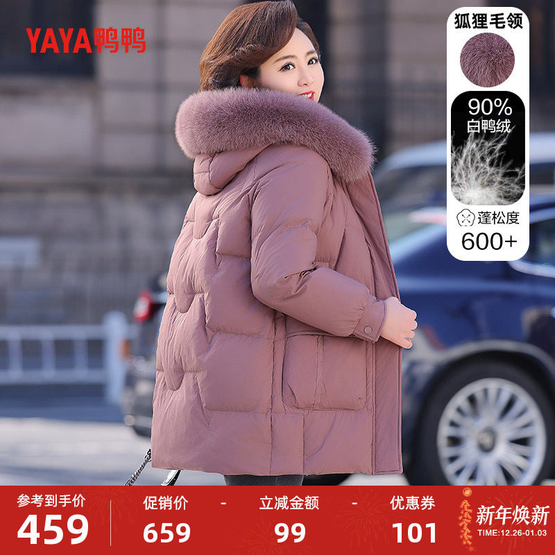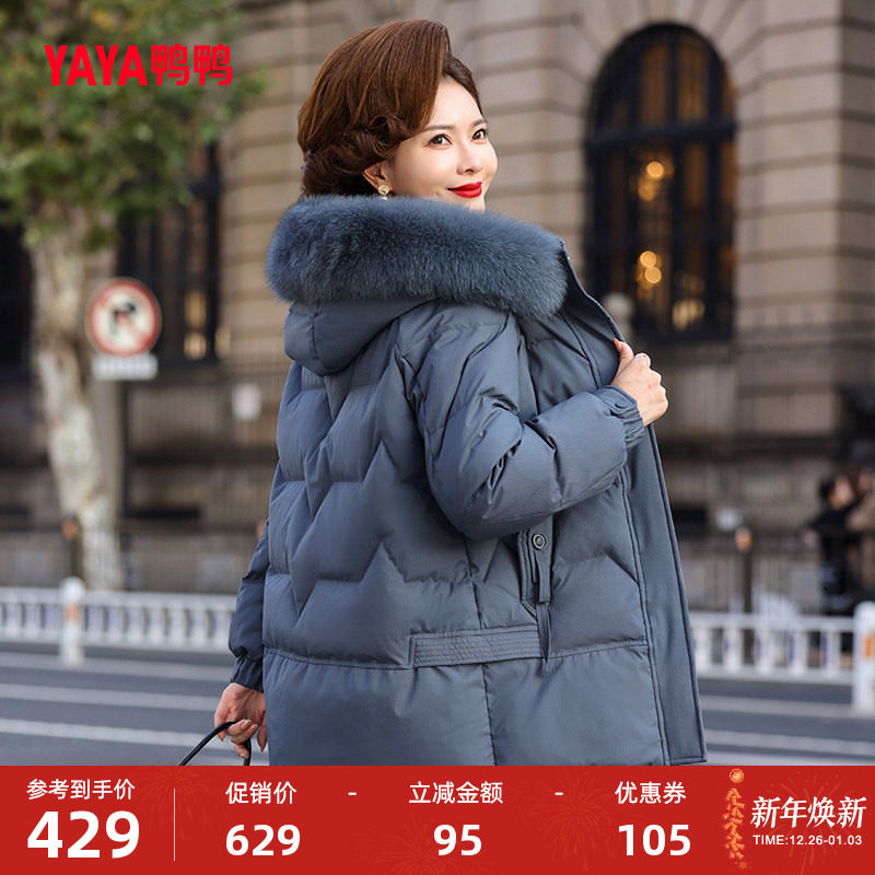 鸭鸭羽绒服女2025冬季中长款连帽狐狸毛收腰显瘦妈妈装中老年外套