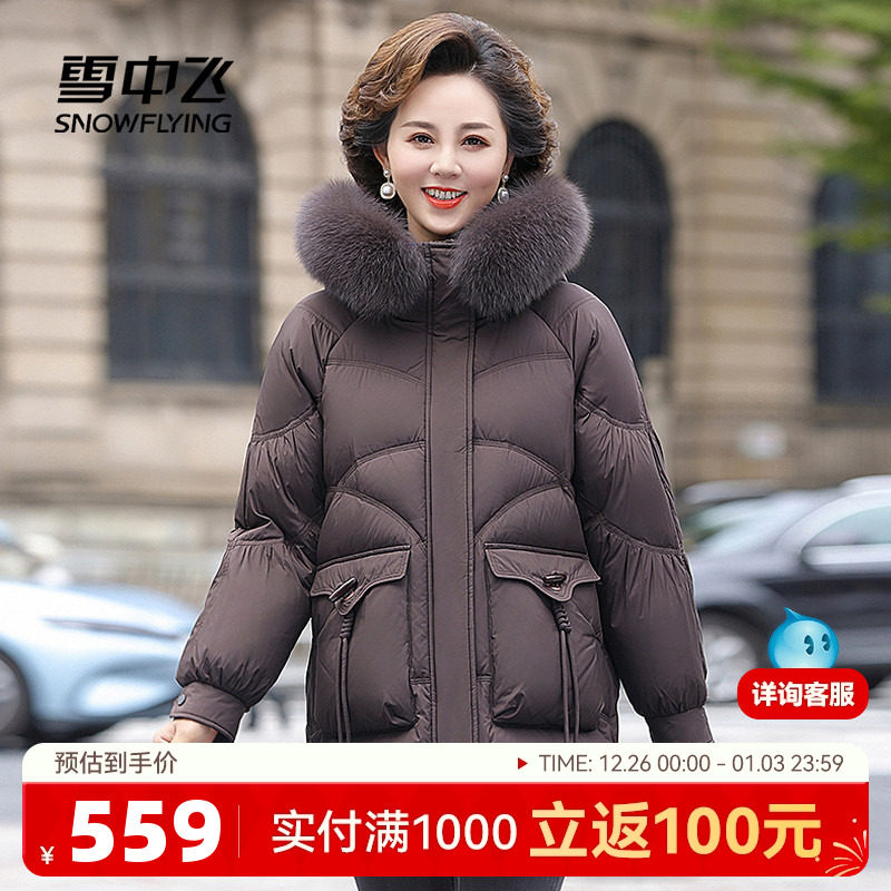 雪中飞羽绒服冬季女款中年妈妈狐狸毛领连帽中长款冬装中老年外套