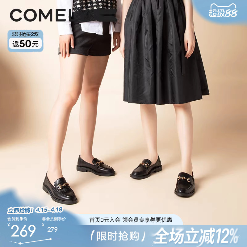 fed英伦风真皮粗跟乐福鞋女复古金属扣小皮鞋一脚蹬圆头深口单鞋