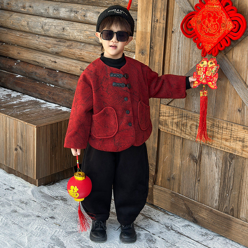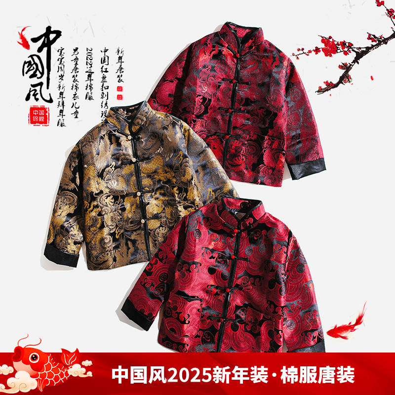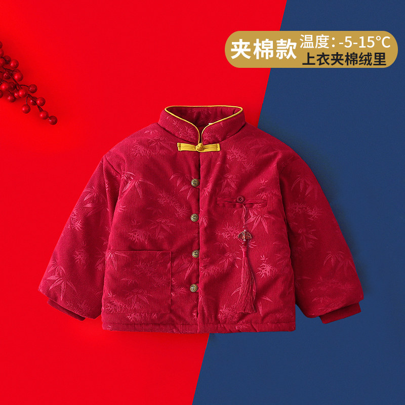 中式拜年服男童冬季红色棉服儿童喜庆唐装夹棉加厚上衣宝宝新年装