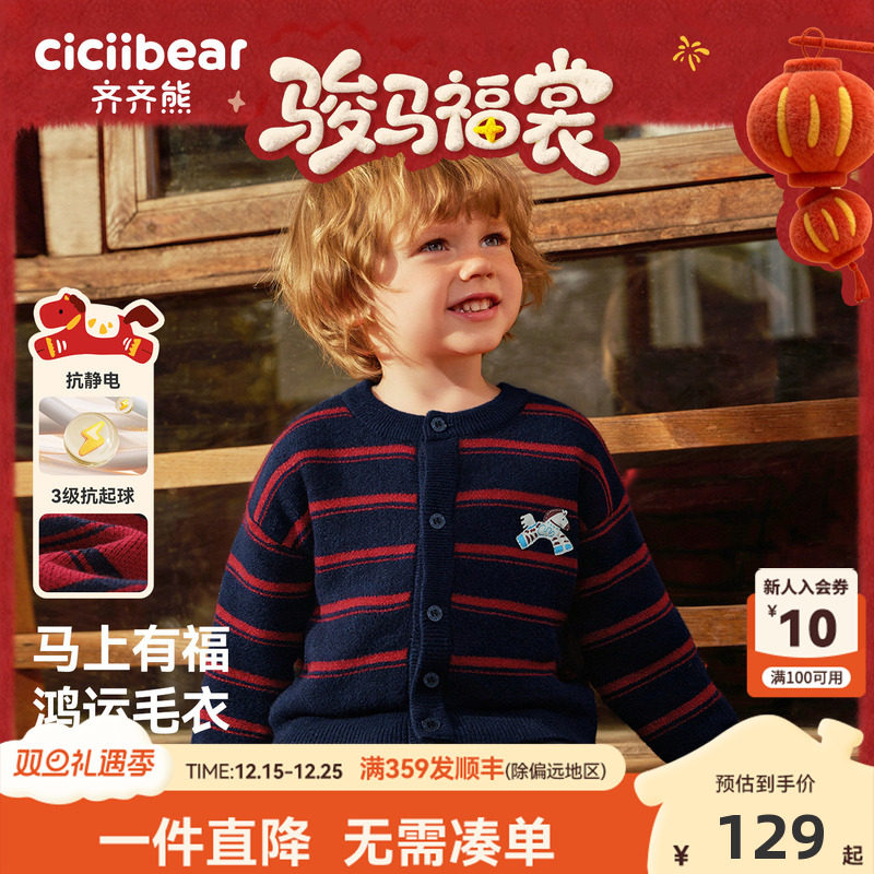 [骏马福裳]齐齐熊男童毛衣开衫冬装新年红色加厚宝宝毛线外套上衣