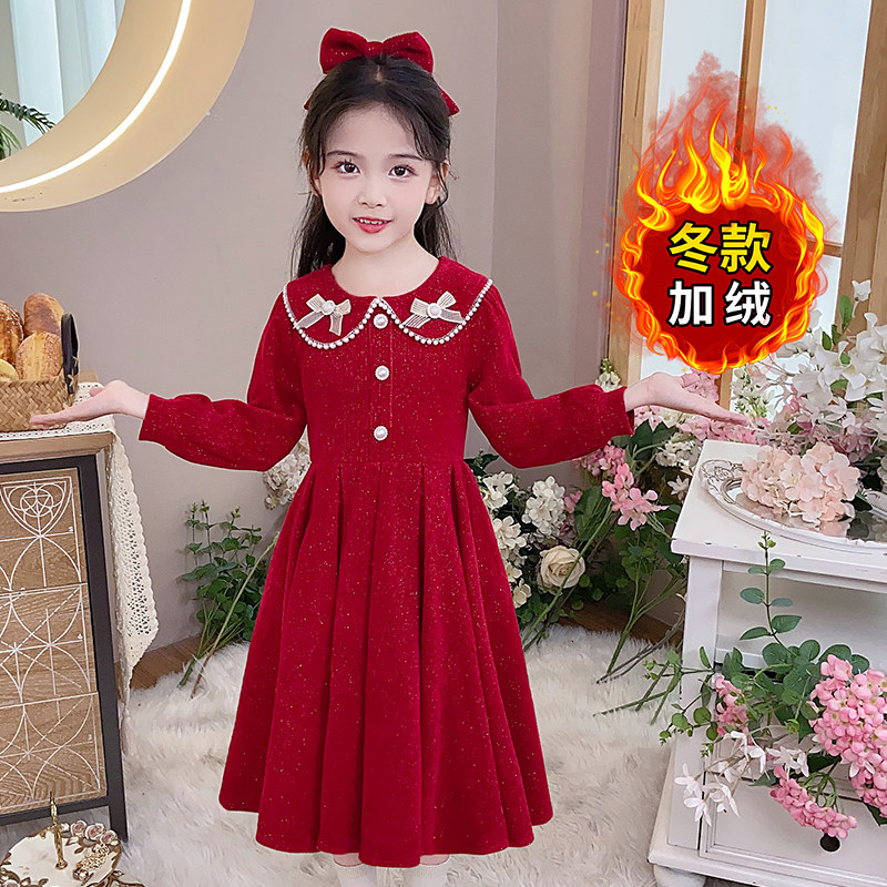 女童冬季加厚连衣裙2024新款加绒儿童公主裙红色冬装女宝宝新年装
