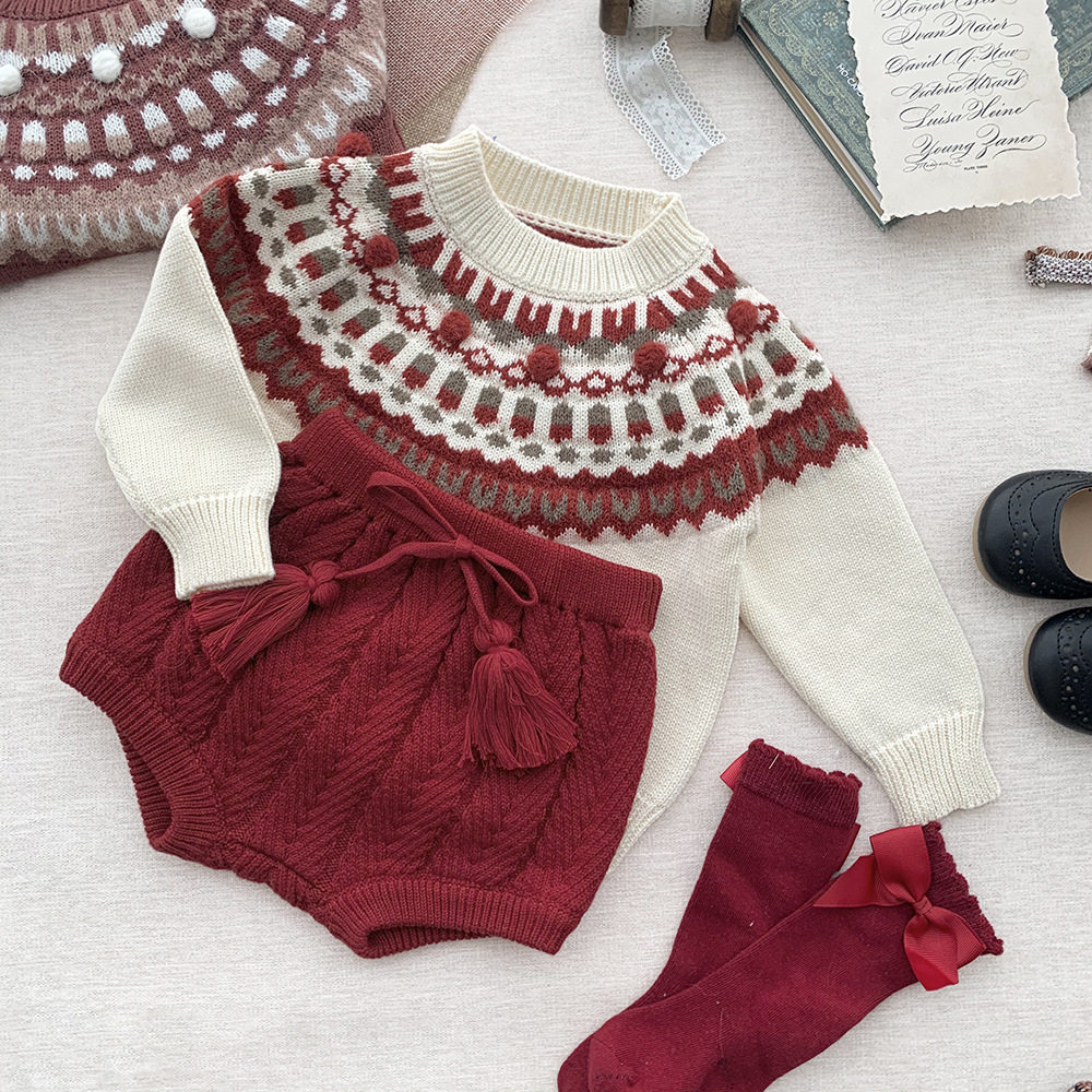 INS秋冬婴童圣诞红色毛衣提花撞色球球套头毛衣男女宝宝新年装