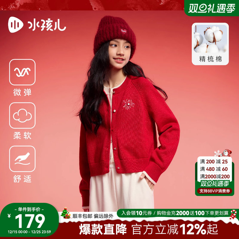 水孩儿女童针织衫2026春季新品宝宝新年装假两件红色毛衣开衫外套