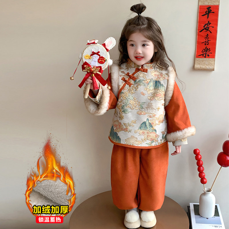 国风女童拜年服套装冬季儿童过年喜庆衣服宝宝新年装女孩加绒加厚