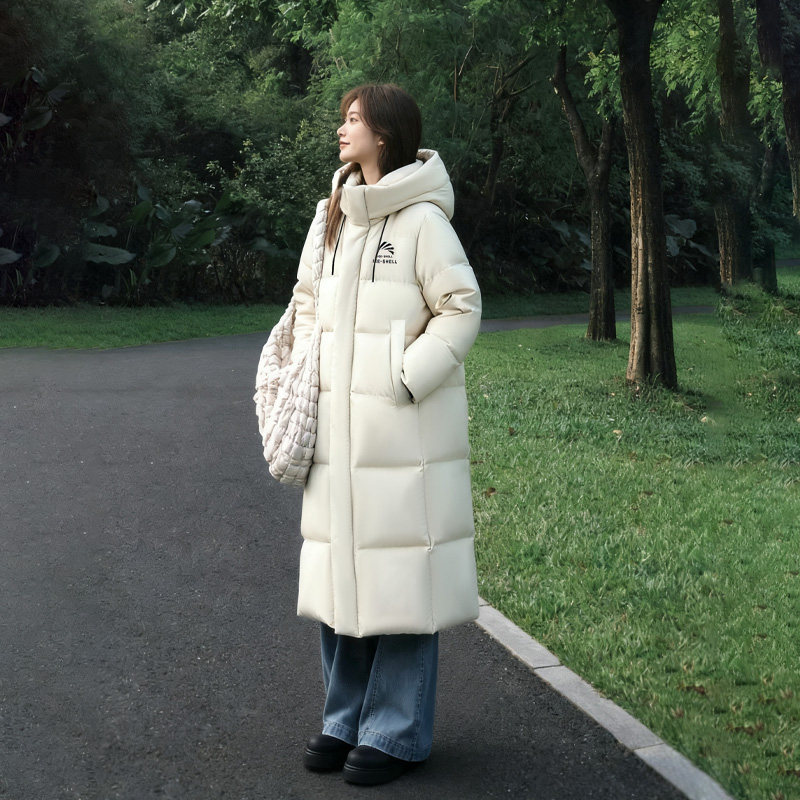 文艺复古宽松大码中长款羽绒服24冬季女装加厚连帽白鸭绒过膝大衣