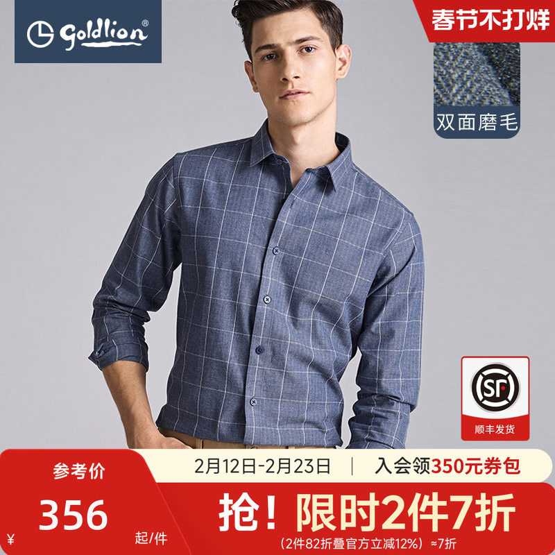 【纯棉磨毛】金利来秋冬男士柔软舒适尖领格子商务休闲长袖衬衫男