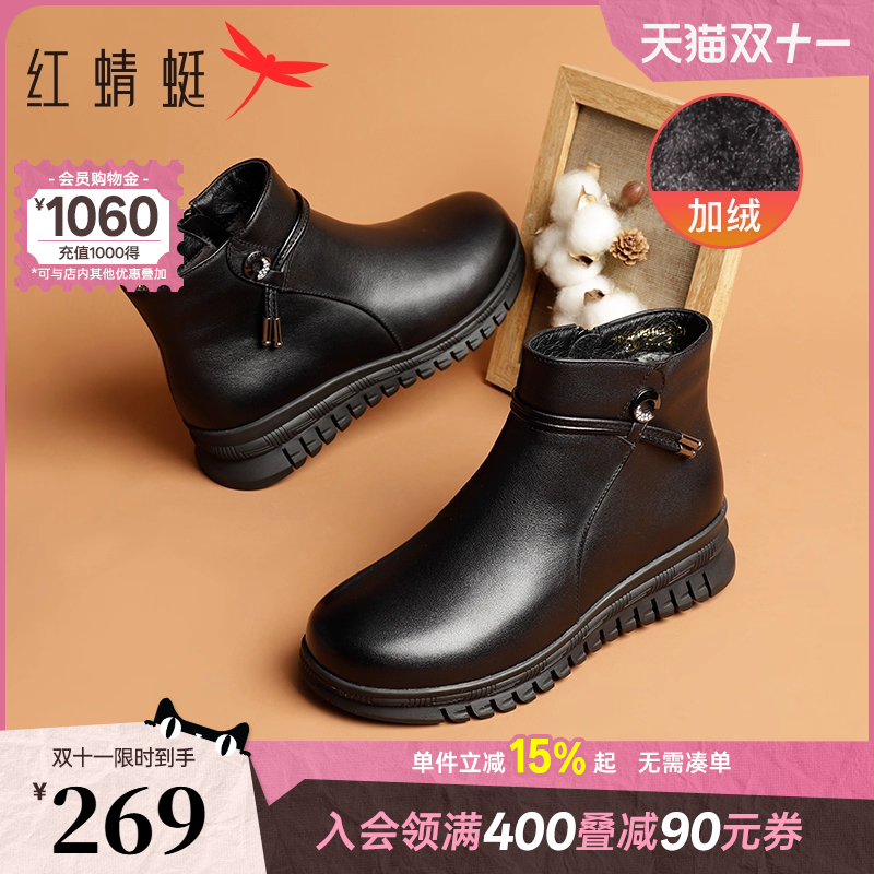 红蜻蜓官方妈妈鞋冬季皮鞋防滑鞋子女鞋保暖女靴中老年人真皮棉鞋