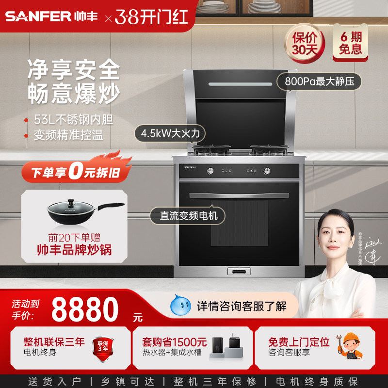 帅丰 U7-9B集成灶53L蒸箱燃气灶侧吸304不锈钢下排一体灶800mm