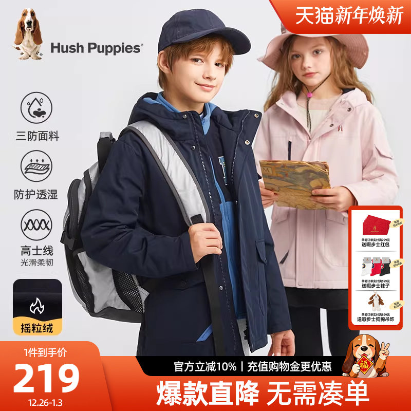 暇步士童装儿童三防加绒风衣女童秋冬装新款户外服男童保暖厚外套