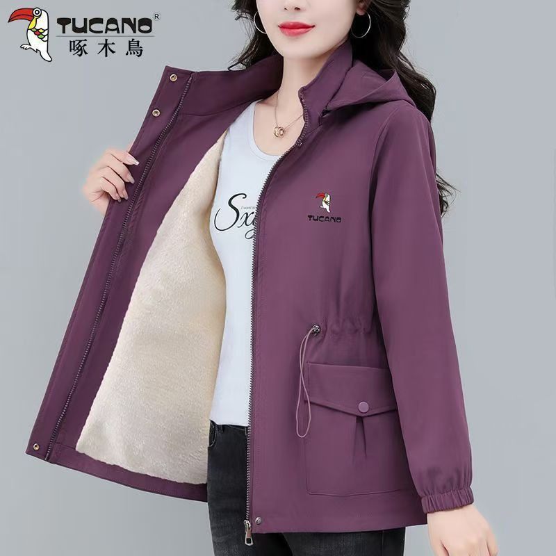 啄木鸟时尚休闲外套女2025春秋新款休闲连帽妈妈舒适加绒风衣女装