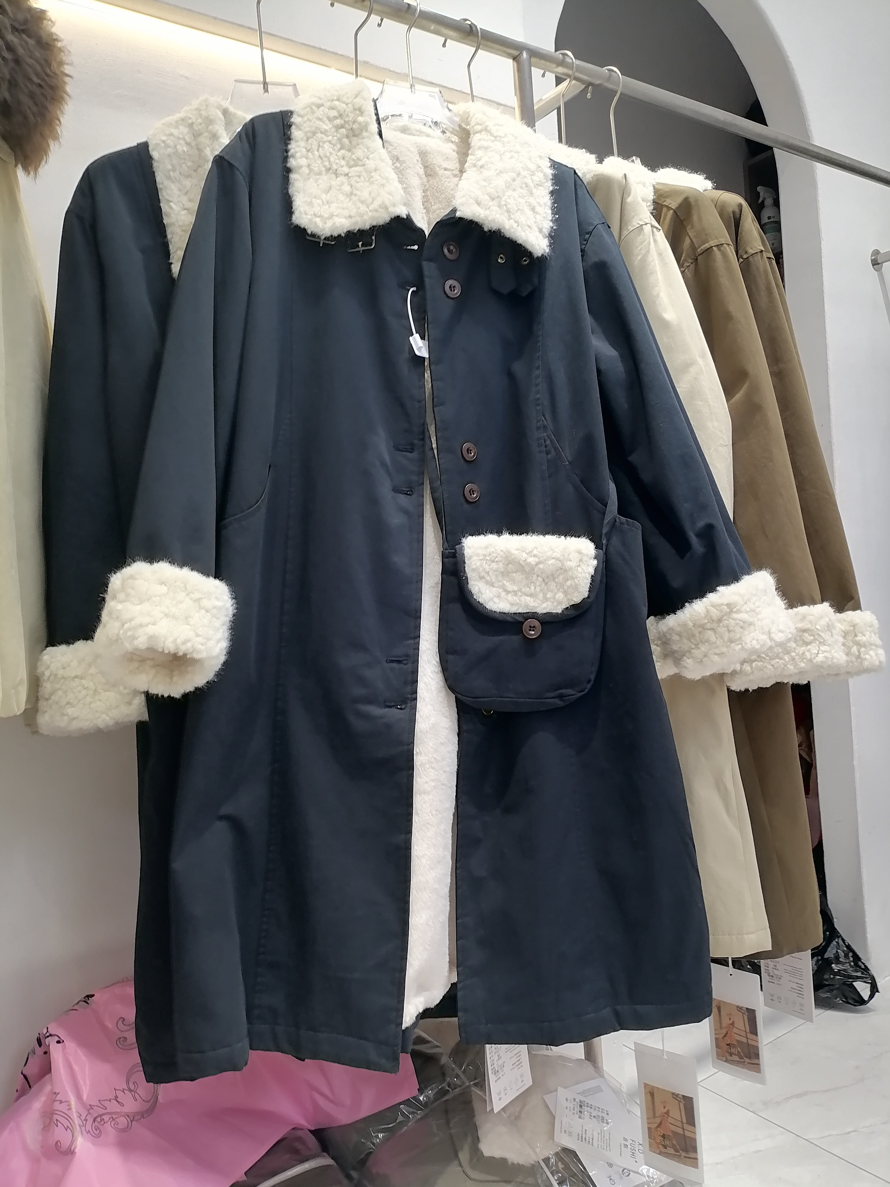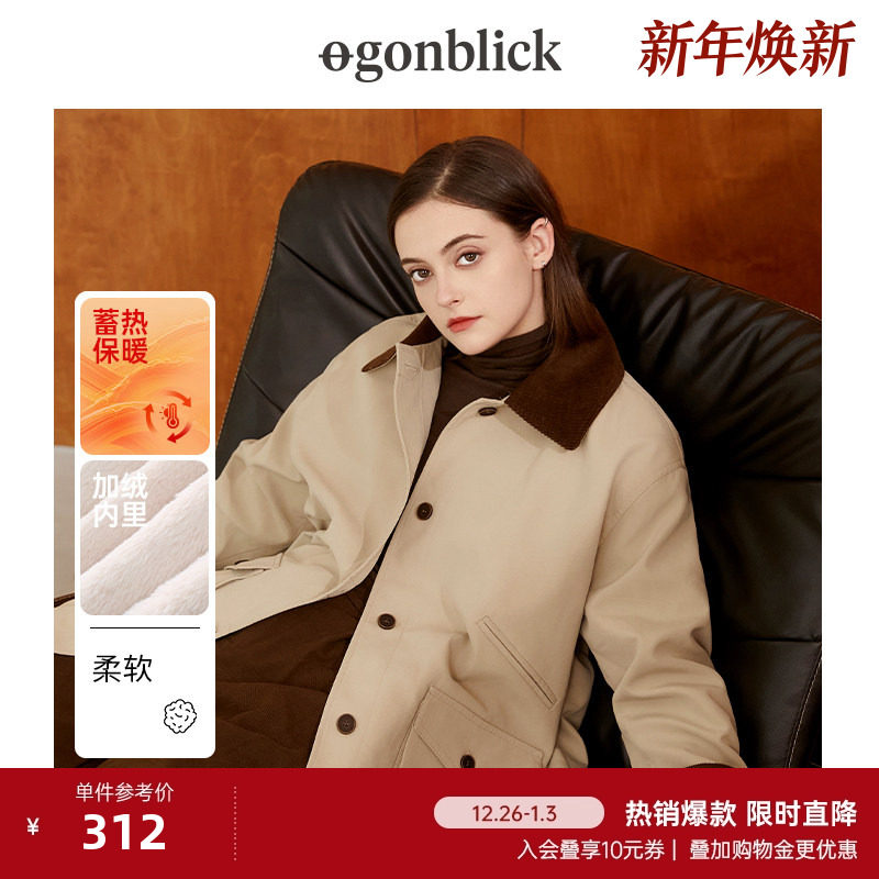 北欧时刻美拉德加绒风衣女秋冬季新款高级感撞色翻领卡其色厚外套