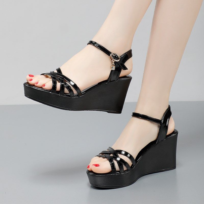 夏季新品坡跟凉鞋镂空编织带软漆皮防水台8cm透气一字鱼嘴女鞋黑