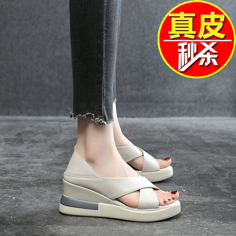 厚底坡跟增高牛皮女凉拖鞋外穿2026新款松糕高跟真皮鱼嘴女鞋皮鞋