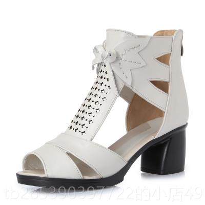 露趾夏季新款罗马凉鞋女粗跟真皮镂空鱼嘴女鞋中跟舒适大码女鞋子