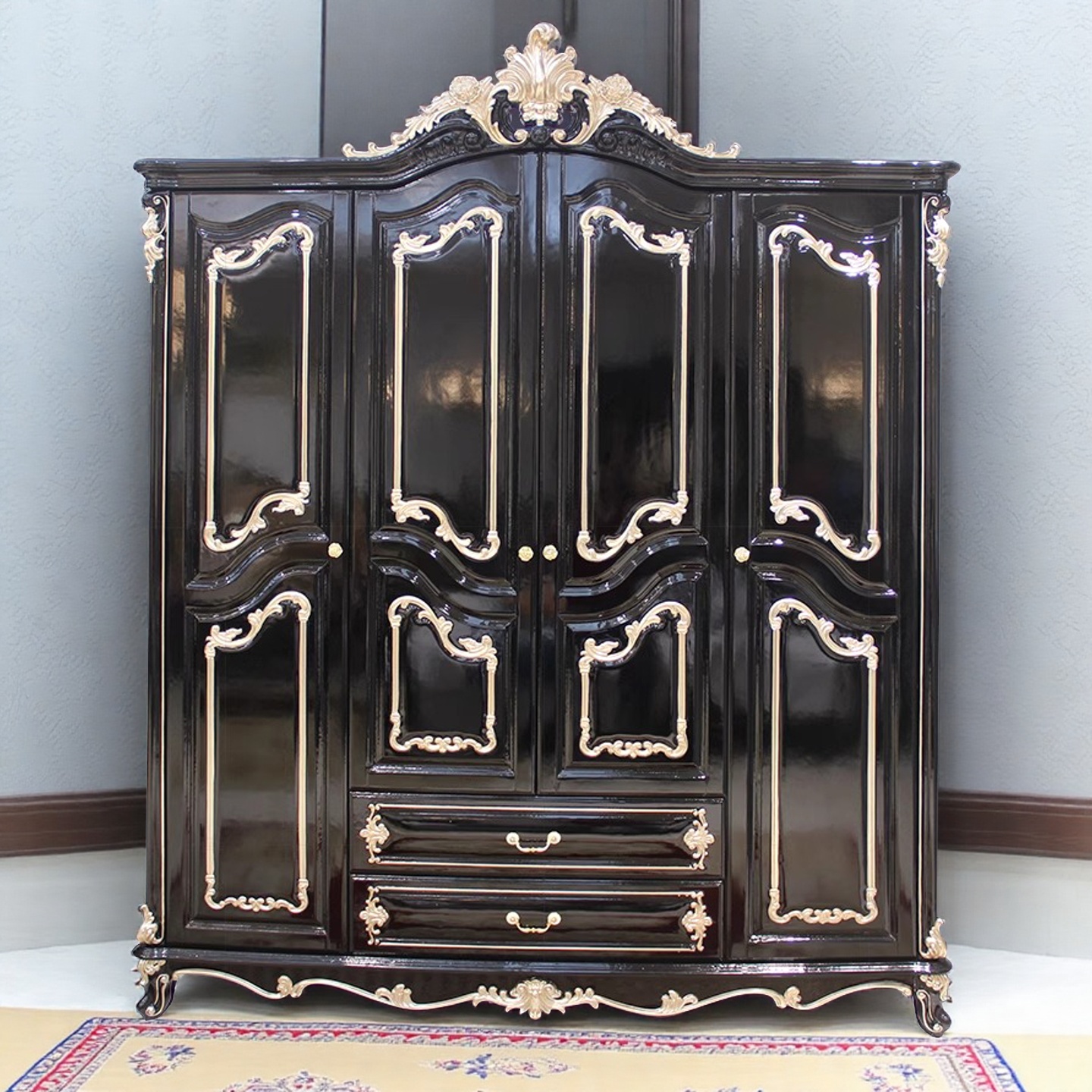 欧式实木雕花衣柜 美式别墅卧室储物柜子复古三门四门黑金大衣柜
