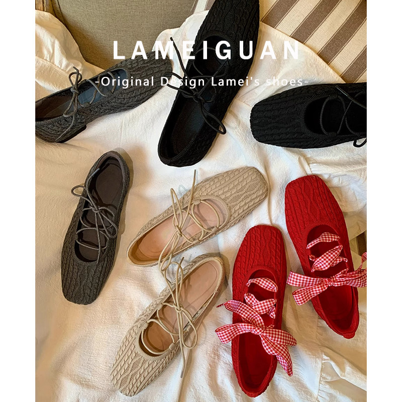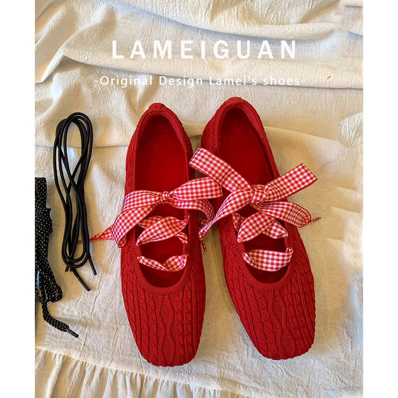 甜美针织绑带浅口芭蕾玛丽珍鞋女春2026新款气质红色方头平底单鞋