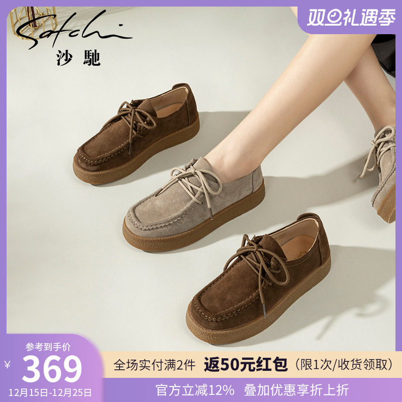 沙驰女鞋厚底平底真皮乐福鞋2025秋冬新款舒适绑带深口休闲单鞋潮