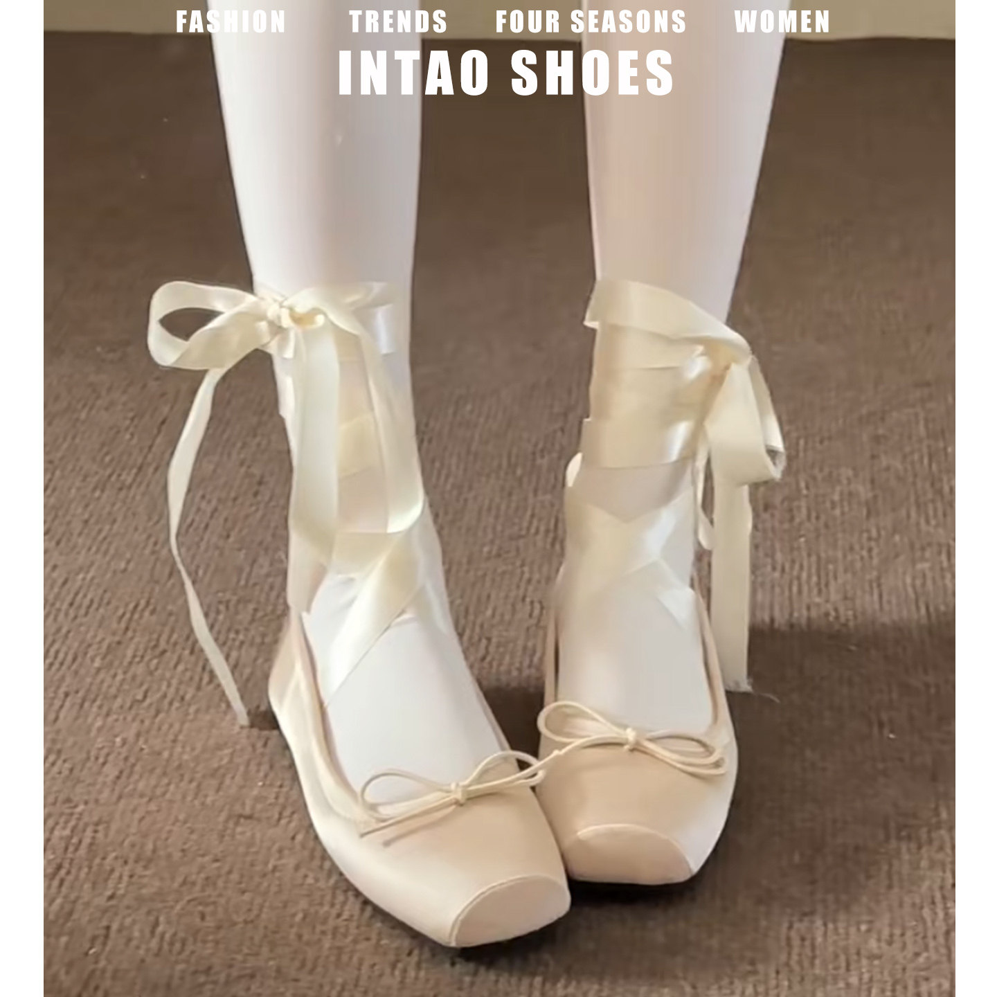 法式方头交叉绑带平底芭蕾鞋女2026年早春新款蝴蝶结浅口绝美单鞋