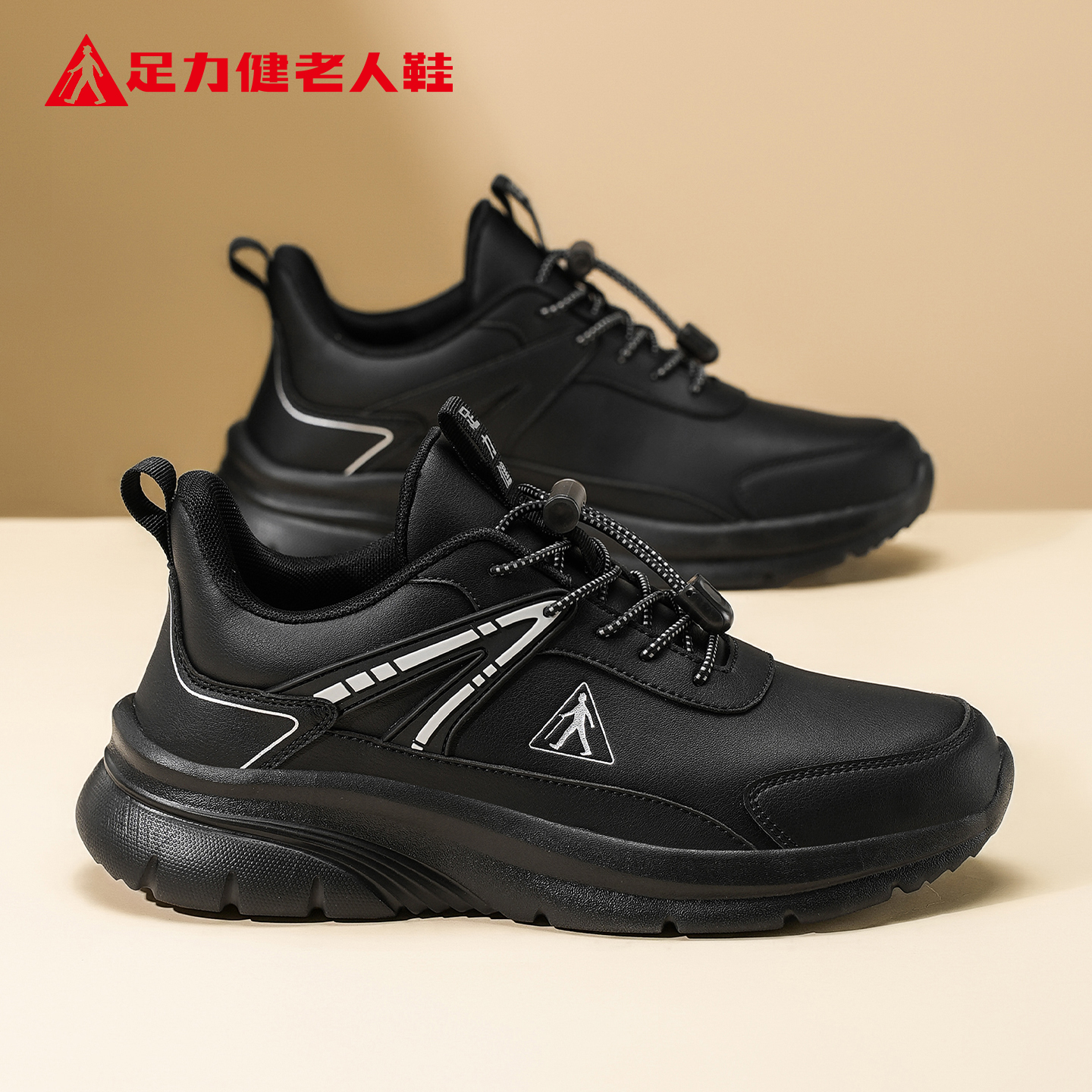 足力健老人鞋官方旗舰2025新款冬季皮面黑色中老年运动爸爸健步鞋