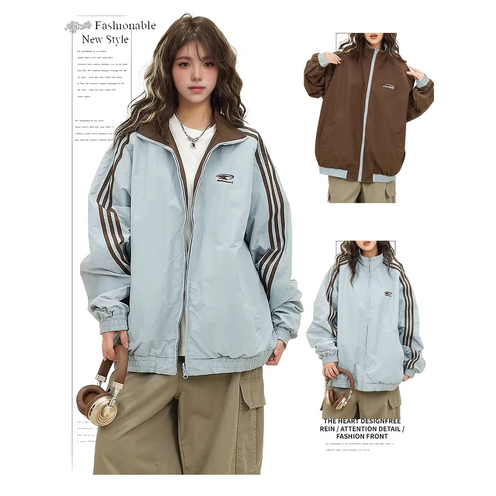 美式三条杠双面穿夹克女春秋宽松bf美式复古运动棒球服学院风外套