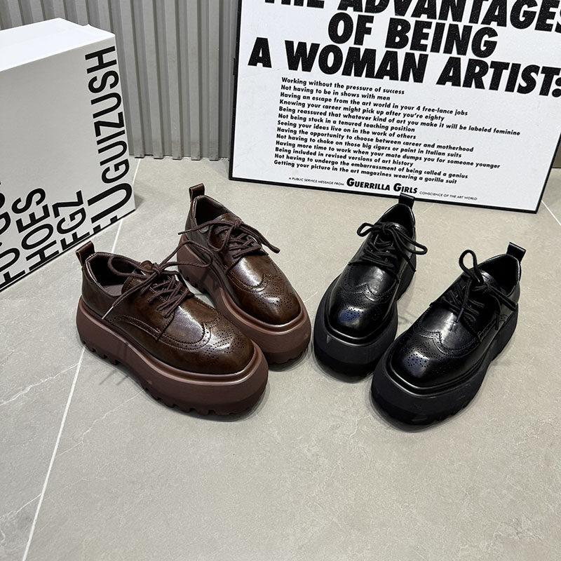 2025秋新款女单鞋方头厚底真皮布洛克雕花松糕底乐福鞋系带小皮鞋