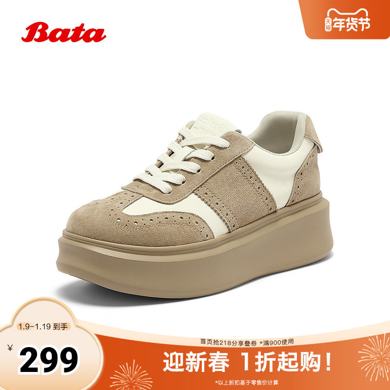 Bata休闲鞋女2025秋新款百搭布洛克厚底通勤松糕运动板鞋20251CM5