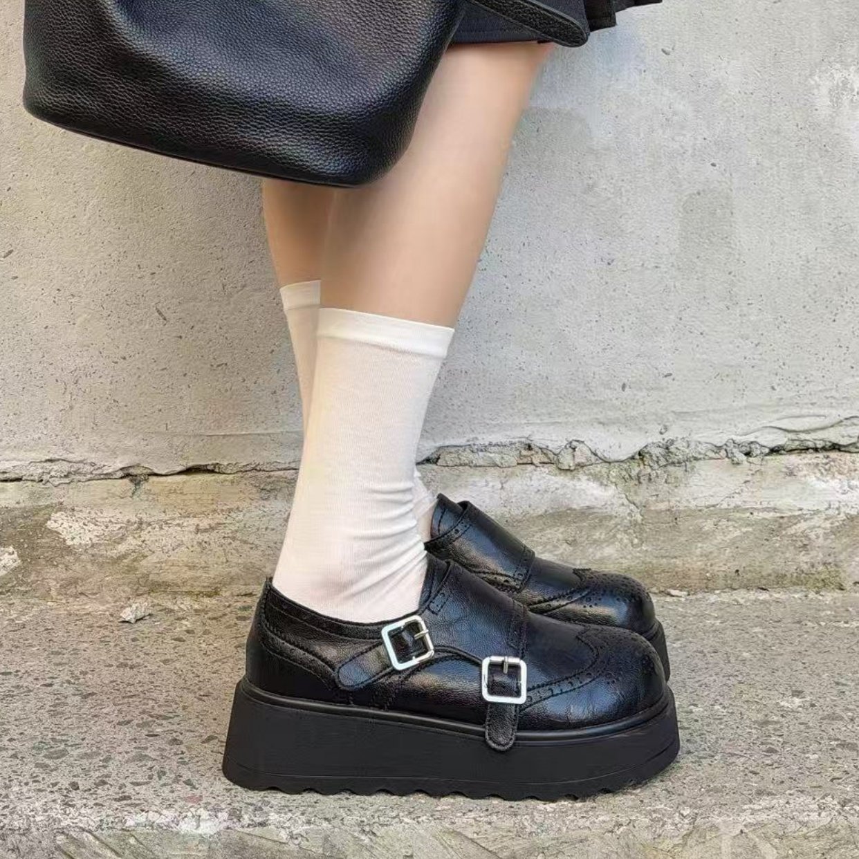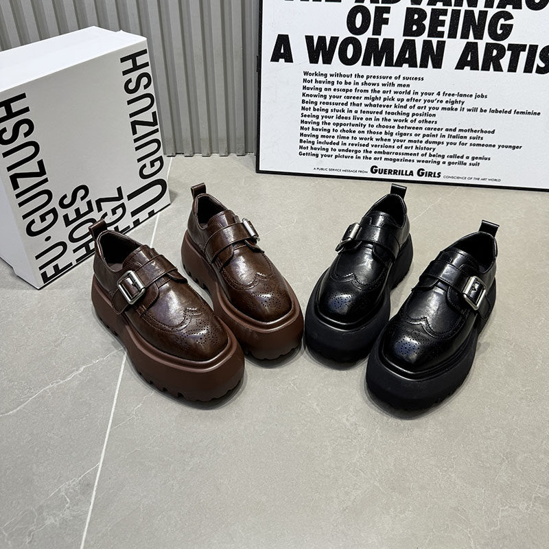 英伦风布洛克雕花厚底乐福鞋女搭扣松糕底复古百搭黑色小皮鞋女潮