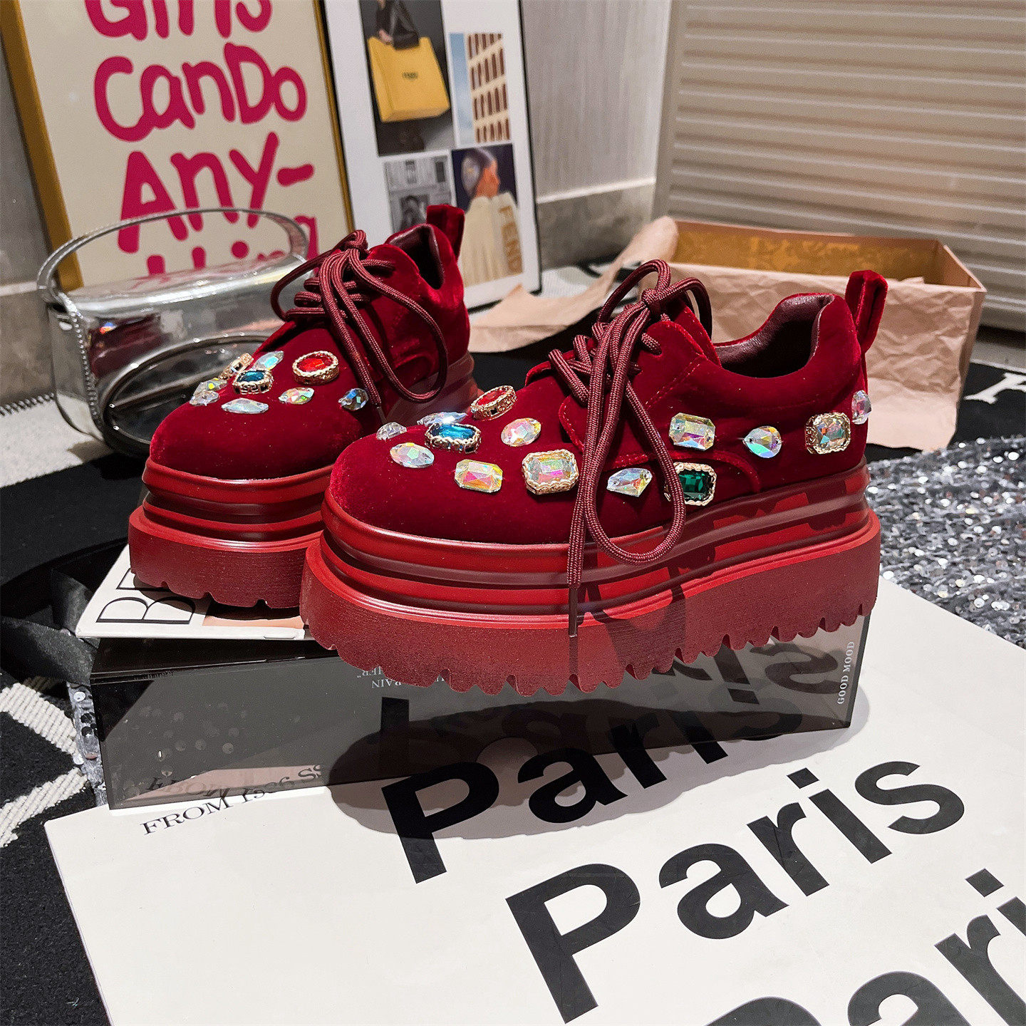 欧货金丝绒面系带彩色水钻厚底松糕JK小皮鞋布洛克单鞋小个子女鞋