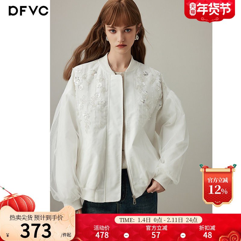 dfvc白色时尚网纱拼接棒球服女2026春季新款重工亮片短款夹克外套