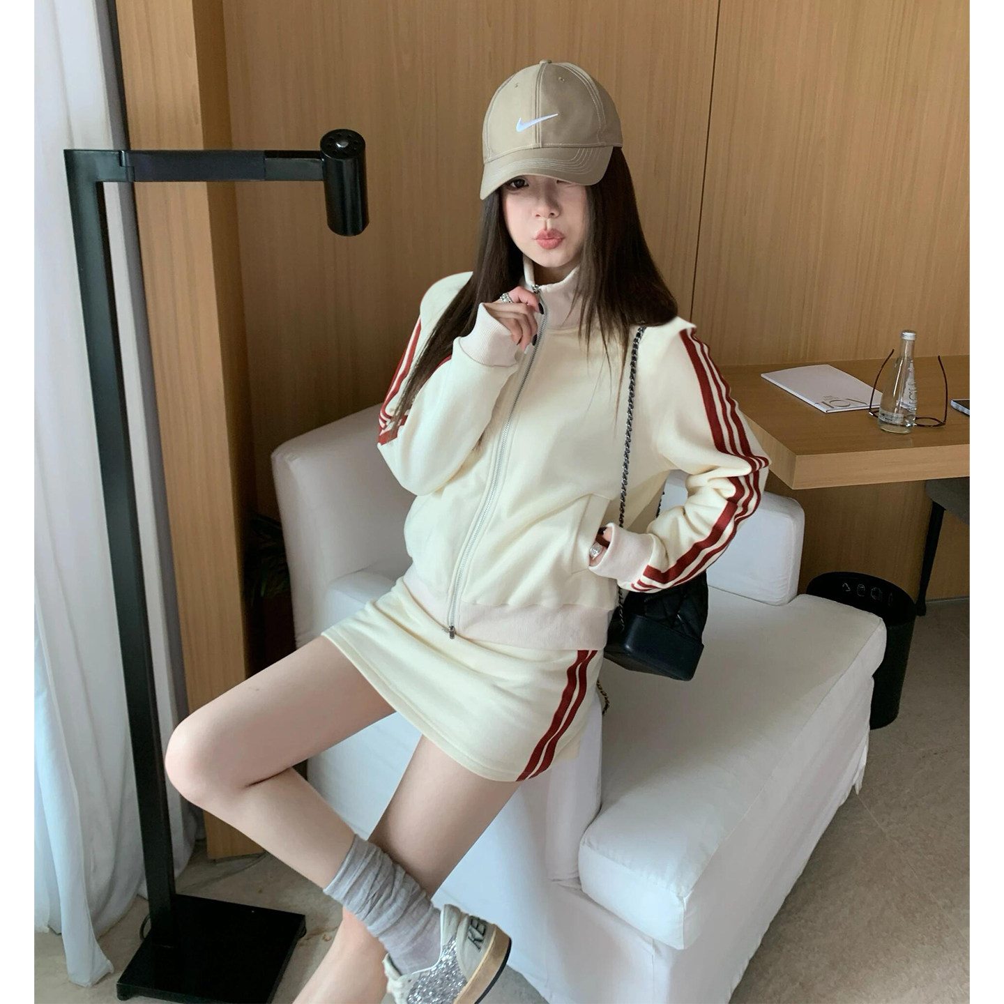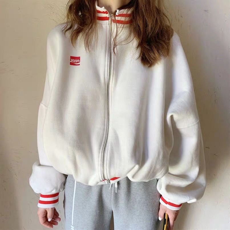 白色开衫立领卫衣女秋冬季加绒加厚宽松慵懒风运动棒球服外套上衣