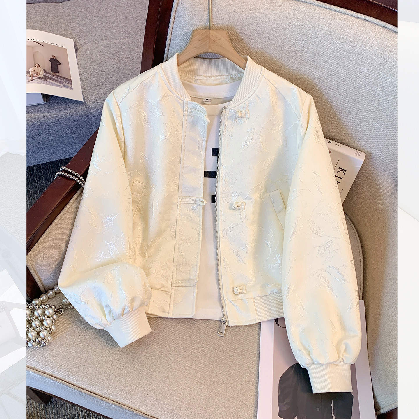 白色新中式国风棒球服外套女圆领2025春秋装新款薄款盘扣短款夹克