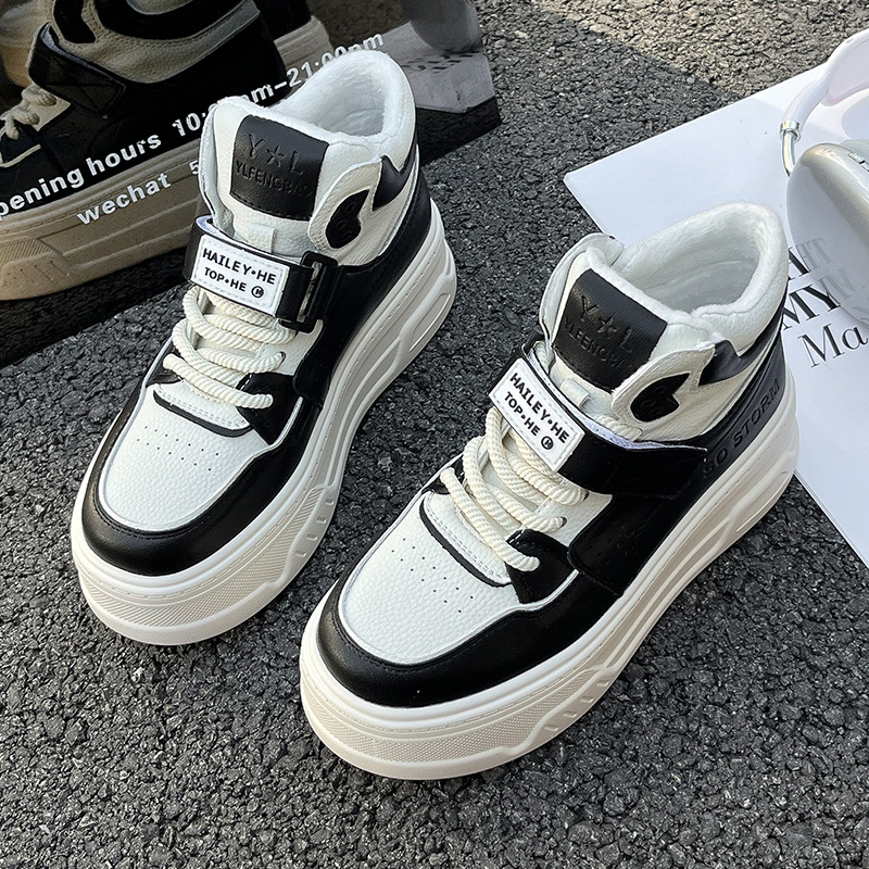 高帮板鞋女ins潮2025春秋新款百搭真皮厚底加绒休闲运动小白棉鞋