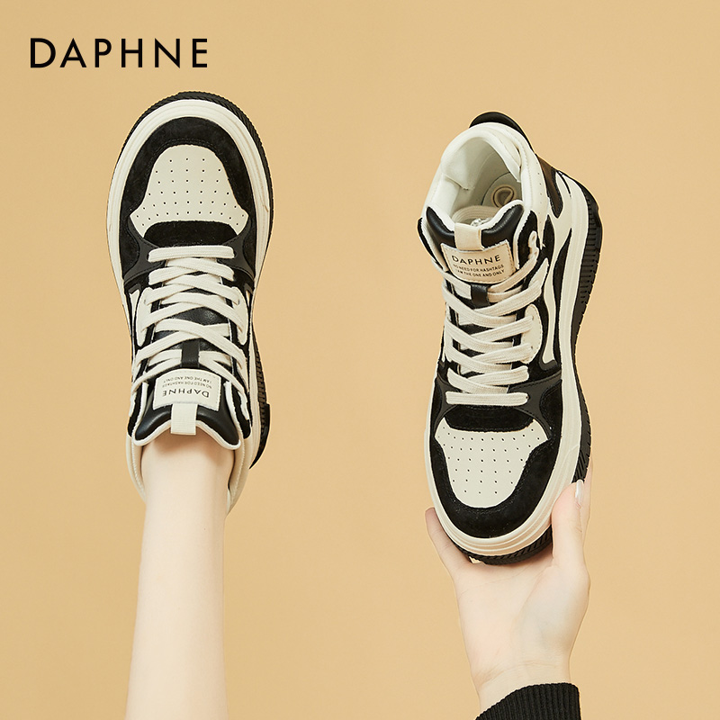 达芙妮真皮高帮鞋女鞋2023新款爆款春秋款熊猫板鞋女款厚底运动鞋