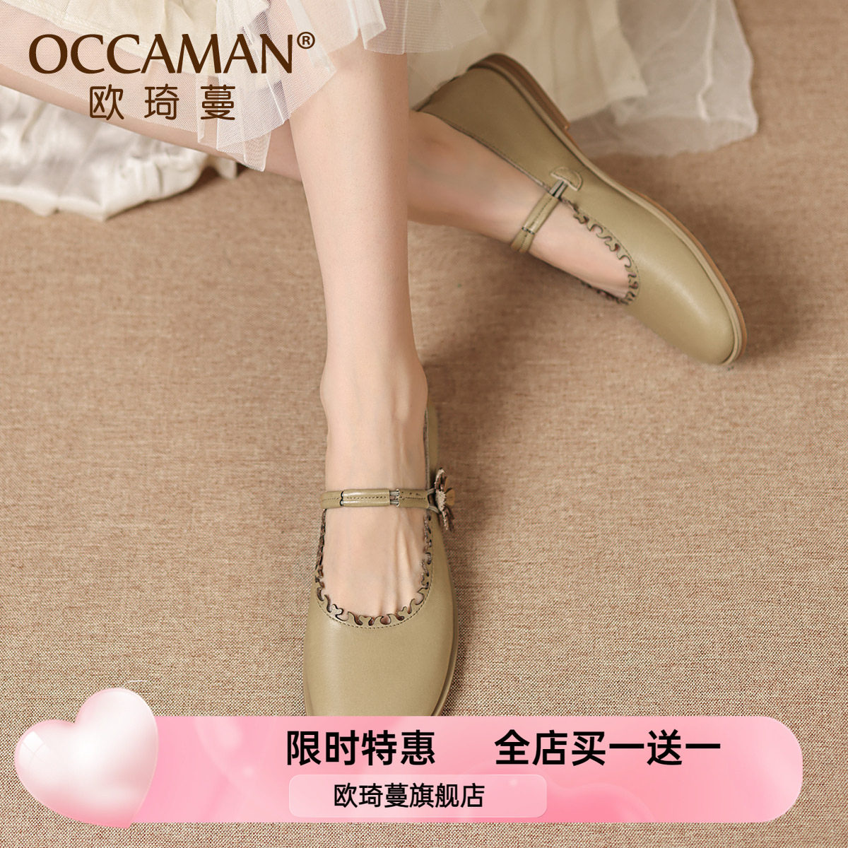 四起哥2026春夏复古风系带浅口单鞋女平底圆头牛皮百搭舒适单鞋潮