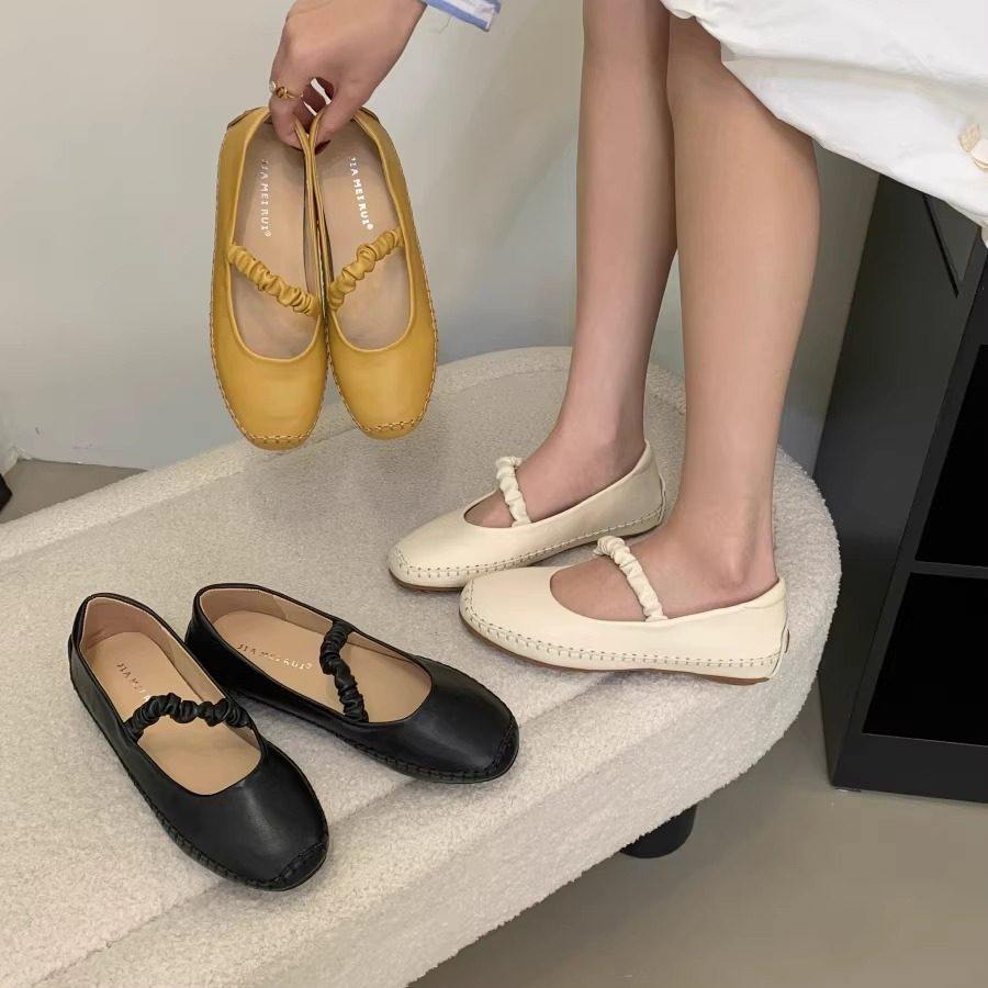 2026年新款圆头单鞋女平底褶皱一脚蹬复古奶奶鞋软底玛丽珍鞋