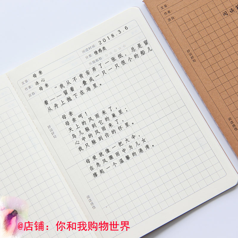牛皮纸学生阅读笔记本16K方格好词好句本A4采蜜本读书记录本