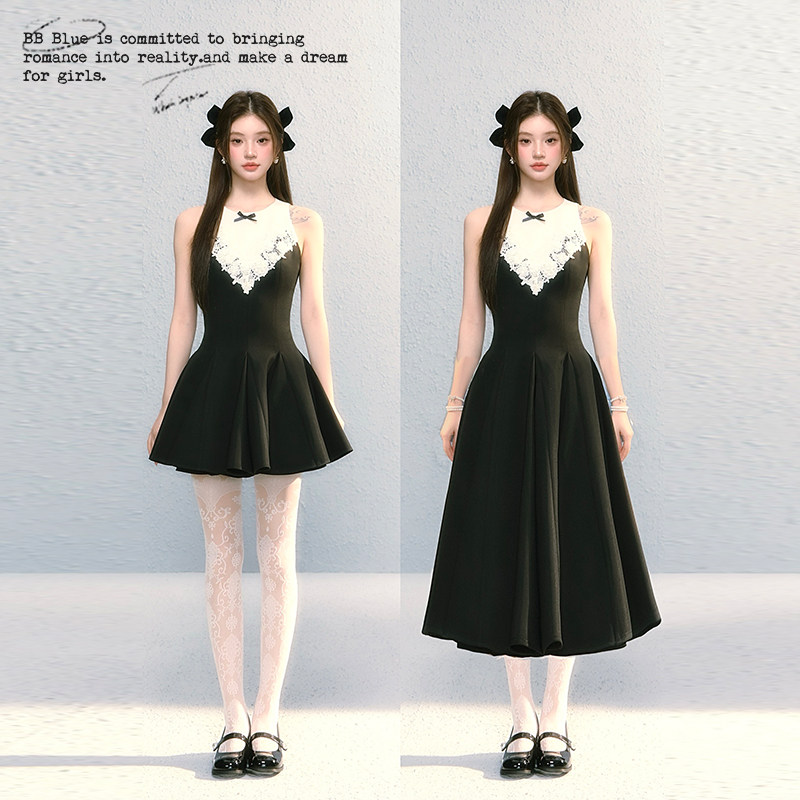 纯欲风高级感小黑裙女拼接蕾丝挂脖收腰连衣裙女夏季生日礼服短裙
