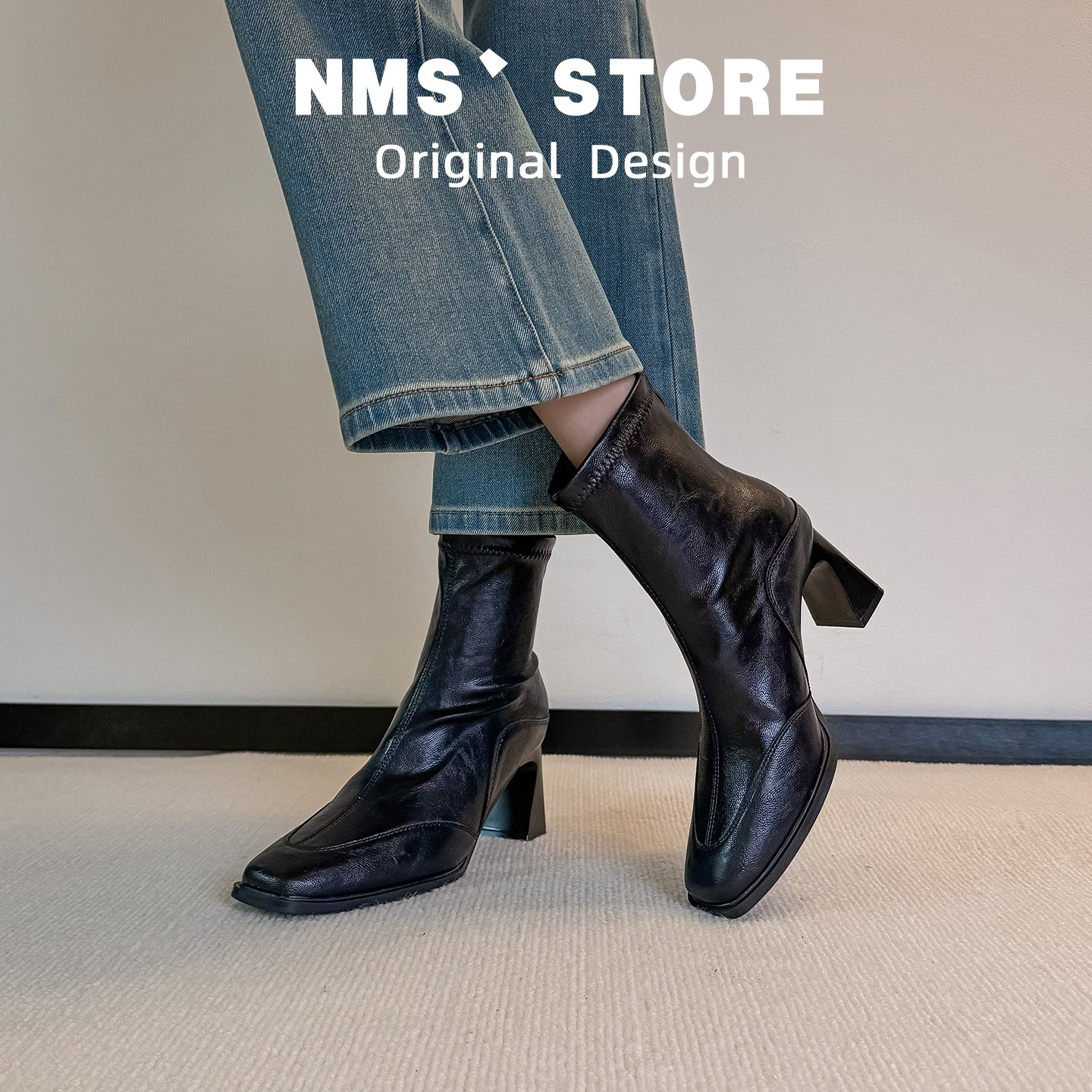 【跟高6cm】复古真皮瘦瘦靴方头显瘦秋冬新款高跟短靴粗跟弹力靴
